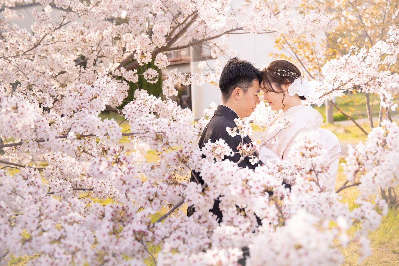 新婦和装1着(白無垢or色打掛or引振袖)・新郎紋付袴1着・着付け・ヘアメイク(新婦)・小物一式・写真撮影・カット数150・ロケ地2カ所(桜+日本庭園or神社)・8Pアルバム・データ付・クリーニング料・ロケ車・有料道路代・ガソリン代